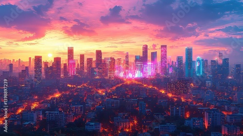 Fototapeta premium Sunset cityscape glowing skyscrapers and illuminated streets