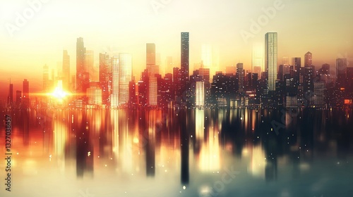 © azi, Fototapeta premium Sunset Cityscape: Golden Hour Reflection