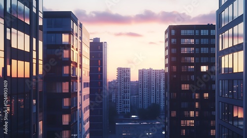© Ariep, Obraz premium Sunset Cityscape: Modern Architecture at Dusk