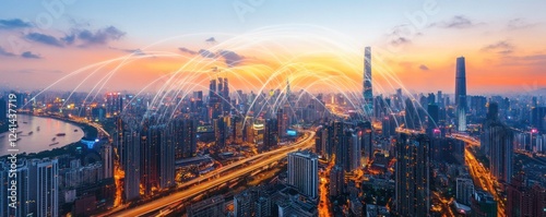 © STwul, Fototapeta premium Sunset Cityscape Network Connections over Urban Skyline