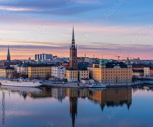 © Dreamnordno, Naklejka premium Sunset cityscape of Stockholm with Riddarholmen and Old Town waterfront