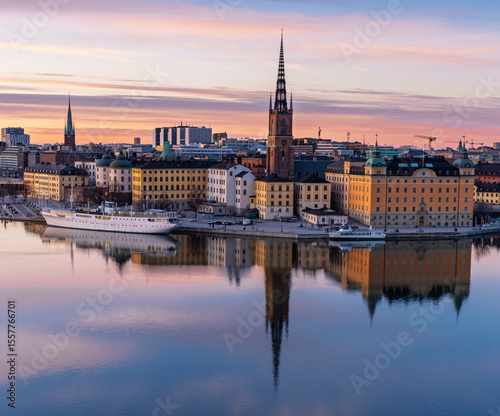 © Dreamnordno, Naklejka premium Sunset cityscape of Stockholm with Riddarholmen and Old Town waterfront