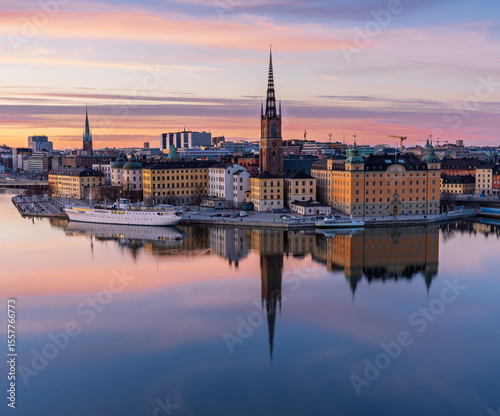 © Dreamnordno, Naklejka premium Sunset cityscape of Stockholm with Riddarholmen and Old Town waterfront