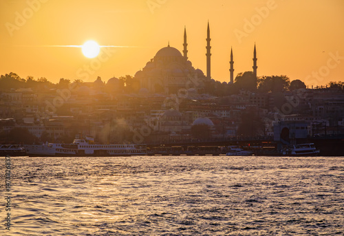 Fototapeta premium Sunset cityscape of the Historic Peninsula area across Bosphorus Strait by Galata Bridge with the Yeni Cami and Suleymaniye Mosques, Istanbul, Turkey