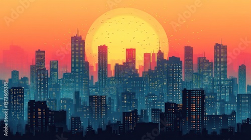 Fototapeta premium Sunset cityscape, skyscrapers, orange sky, birds, urban background, website...