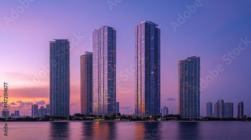 © fuad, Fototapeta premium Sunset cityscape view of tall buildings by the water.