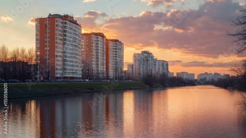 Obraz premium Sunset Cityscape with Apartment Buildings and River Reflection