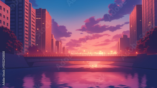 © Matsuo Studio, Fototapeta premium Sunset Cityscape with Bridge and River