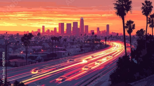 Obraz premium Sunset cityscape with highway traffic light trails.