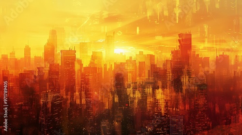 Fototapeta premium Sunset Cityscape with Warm Colors and Digital Effects