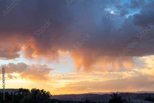 © Sonja, Fototapeta premium Sunset cloudscape over the desert of Arches National Park near Moab, Utah, USA with blue sky coloring orange and dark clouds and streaks, curtains or Virga of precipitation falling from the clouds