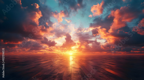Obraz premium Sunset Cloudscape with Wooden Floor Background