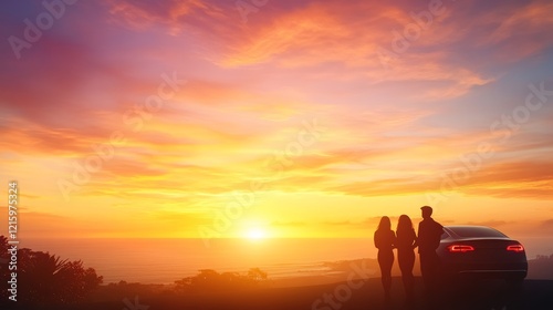 © Big9869, Obraz premium Sunset Coastal Road Trip Family Silhouette