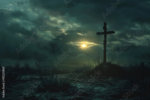 Naklejka premium Sunset Crucifix in a Peaceful Field - Spiritual Reflection and Serene Golden...