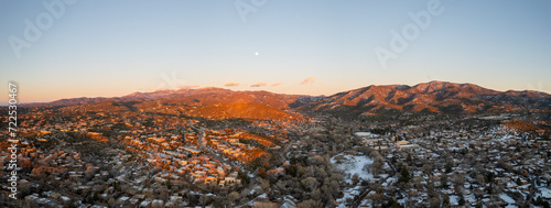 Obraz premium Sunset drone panorama above Santa Fe, New Mexico in the winter.