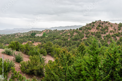 © Kristina Blokhin, Fototapeta premium Sunset evening on cloudy overcast day in Santa Fe, New Mexico mountains in Tesuque community neighborhood with green plants