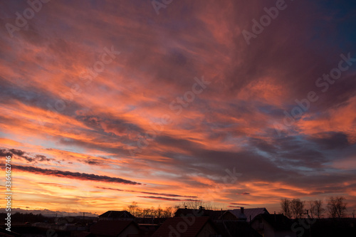 Fototapeta premium Sunset. Evening sky, clouds are painted in different bright colors: blue, red, orange, purple, pink, yellow.