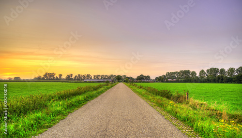Fototapeta premium Sunset falls over an empty country road in a rural landscape in The Netherlands.
