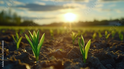 Fototapeta premium Sunset field sprouts emerging, rural agriculture growth