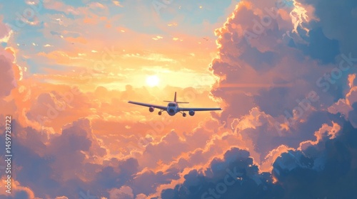 Fototapeta premium Sunset Flight: Airplane Soaring Through Golden Clouds