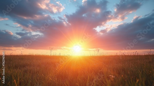 Fototapeta premium Sunset glowing over green grassy field with soft clouds in colorful sky, peaceful nature landscape for background, relaxation, meditation, outdoor scenery, warm golden light evening atmosphere