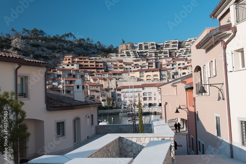 © Nicola Simeoni, Obraz premium Sunset, golden light on the seaside village. Love Walk