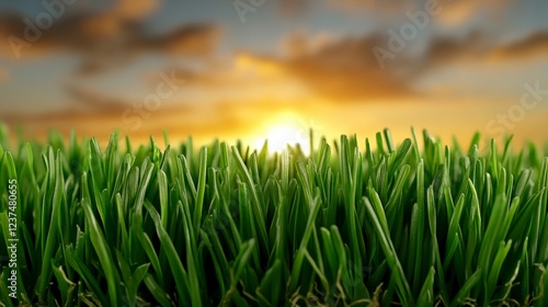 © NAPHAT, Fototapeta premium Sunset Grass Blades: Close-up view of vibrant green grass blades silhouetted against a breathtaking sunset, showcasing the warm hues of the sky and the delicate texture of nature.