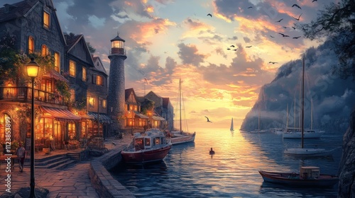 Fototapeta premium Sunset harbor town, lighthouse, boats, quaint buildings.