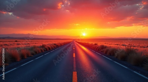 Naklejka premium Sunset Highway A Journey Towards the Radiant Horizon, Where the Asphalt Ribbon Unfurls Under a Fiery Sky
