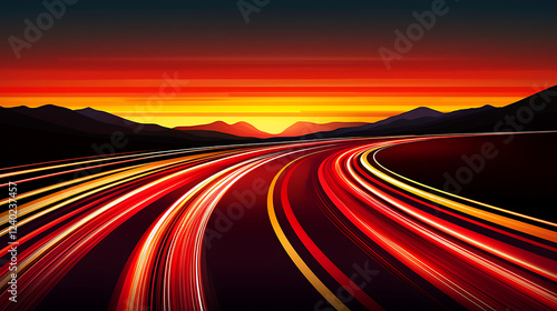 Naklejka premium Sunset highway speed driving, mountain backdrop, travel