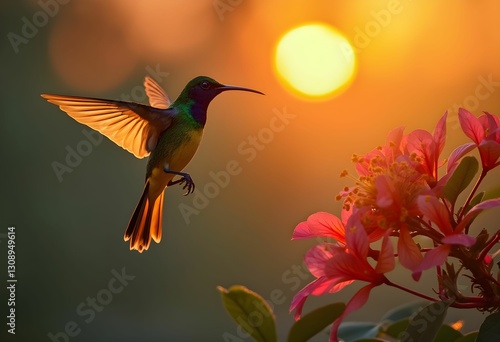 Naklejka premium Sunset-Hued Sunbird Near Tropical Blooms
