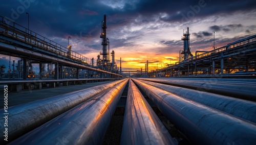 © Viral, Fototapeta premium Sunset hues illuminate a vast industrial refinery, showcasing intricate pipelines and towering structures against a dramatic sky.