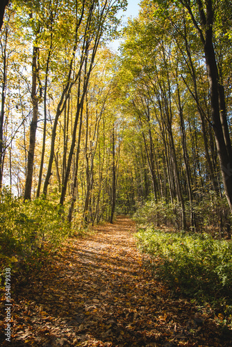 © Fauren, Fototapeta premium Sunset illuminates a forest path and surrounding colourful trees with autumn leaves in a park near Ostrava, Czech republic