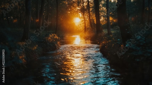 © Penatic Studio, Obraz premium Sunset Illuminates Forest Stream Water Flowing Through Trees