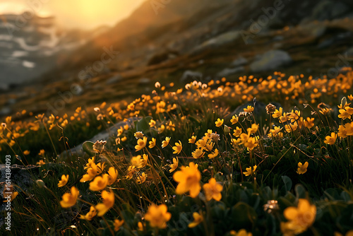 © Adnan, Fototapeta premium Sunset illuminates yellow flowers with mountain backdrop