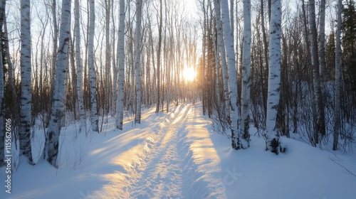 © BerkahStock, Naklejka premium Sunset illuminating a snowy path through a birch forest.