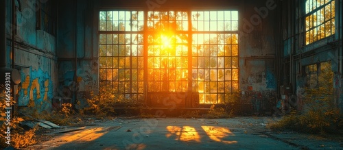 © GoDress, Naklejka premium Sunset illuminating abandoned factory interior.