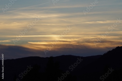© Benjamin, Fototapeta premium Sunset in a cloudy sky over the mountains in Norway