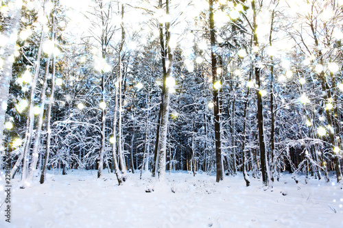 © Swetlana Wall, Fototapeta premium Sunset in a german winter forest and snowfall.