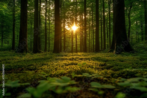 © Hayijnum, Obraz premium Sunset in a lush green forest with moss covered ground.