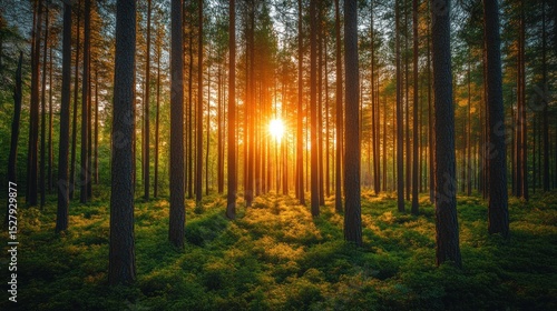 © Umi, Fototapeta premium Sunset in a pine forest, sun rays through trees, nature scene.
