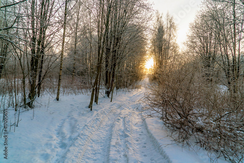 © amarinchenko106, Obraz premium Sunset in a winter forest with a distant road.