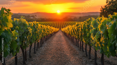 Naklejka premium Sunset in countryside with vineyard in autumn
