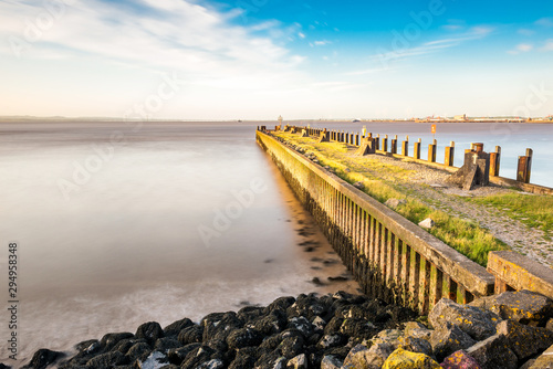 © valdisskudre, Fototapeta premium Sunset in England, rocky Portishead coast line in long exposure capture.