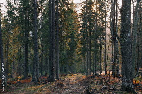 Obraz premium Sunset in forest road.
