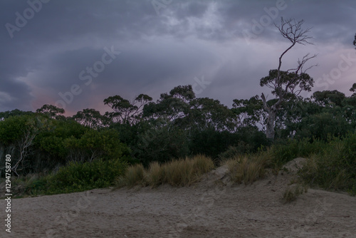 © user, Fototapeta premium sunset in Hobart Kingston beach with dramatic sky and trees