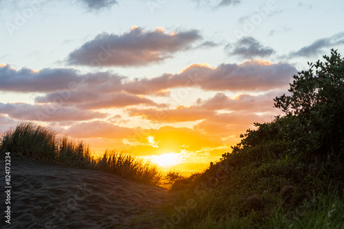 © Rodrigo, Obraz premium Sunset in Piha, beautiful sunset over a coastal landscape with golden light illuminating the clouds and grasses, creating a serene atmosphere