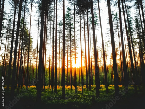 Obraz premium Sunset in pine forest, nature background