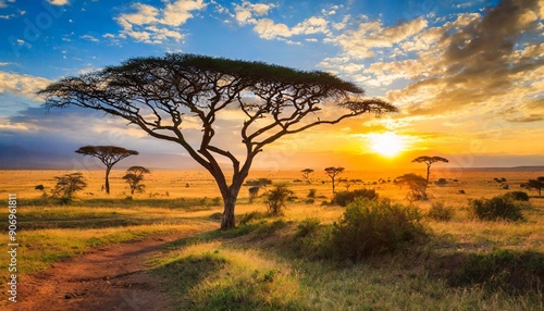 © Artbi, Obraz premium Sunset in savannah of Africa with acacia trees, Safari in Serengeti of Tanzania