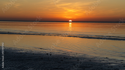 © MSM, Naklejka premium Sunset in Sealine with beautiful sand pattern emerged due to low tide.
